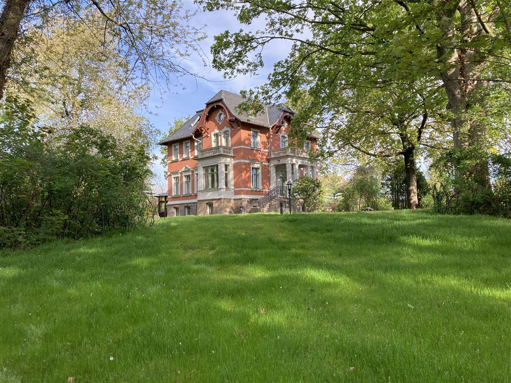 Freistehende herrschaftliche Villa umzäunt vom alten Baumbestand und großzügiger Gartenanlage.