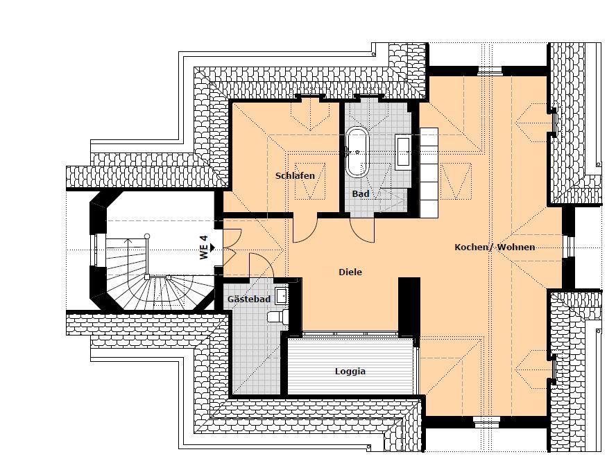 Die Wohnung erstreckt sich über das gesamte Dachgeschoss. Eine Klimaanlage schafft Abkühlung an heißen Sommertagen. Zusätzliche Oberlichter bringen Helligkeit in Wohn- und Schlafraum. Genießen Sie den Sommer auf ihrer Dachterrasse oder in ihrem eigenen Gartenanteil auf dem Grundstück. Fußbodenheizung in allen Räumen. Die Wohn- und Schlafräume, sowie der Flur sind mit Laminat ausgestattet, die Bäder erstrahlen in weißem Marmor. Ein Bad mit Fenster, Wanne und Dusche, sowie ein Gäste-WC vorhanden. Die Küche wird mit einer hochwertigen Einbauküche mit High End Geräten ausgestattet und ist im Mietpreis bereits inklusive. Ein Kühlschrank ist nicht vorhanden. Ein Keller gehört ebenfalls zur Wohnung. Zusätzlicher Hauswirtschaftsraum im Kellergeschoss mit Waschmaschinenanschluss. Ein Stellplatz auf dem Grundstück ist ebenfalls im Mietpreis inklusive.