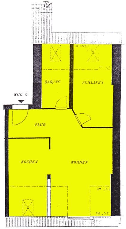 Die Dachgeschosswohnung besteht aus einem schönen großen Wohnzimmer mit offenen Küchenbereich. Diese ist aber optisch durch eine Mauer abgetrennt und bietet noch Platz für einen Esstisch. Das Schlafzimmer ist hofseitig ausgerichtet. Das Bad mit Wanne, WMA und Fenster ebenfalls hofseitig ausgerichtet. Die Wohnung ist bis auf Bad und Küche komplett mit Laminat verlegt. Bad und Küche sind gefliest.
